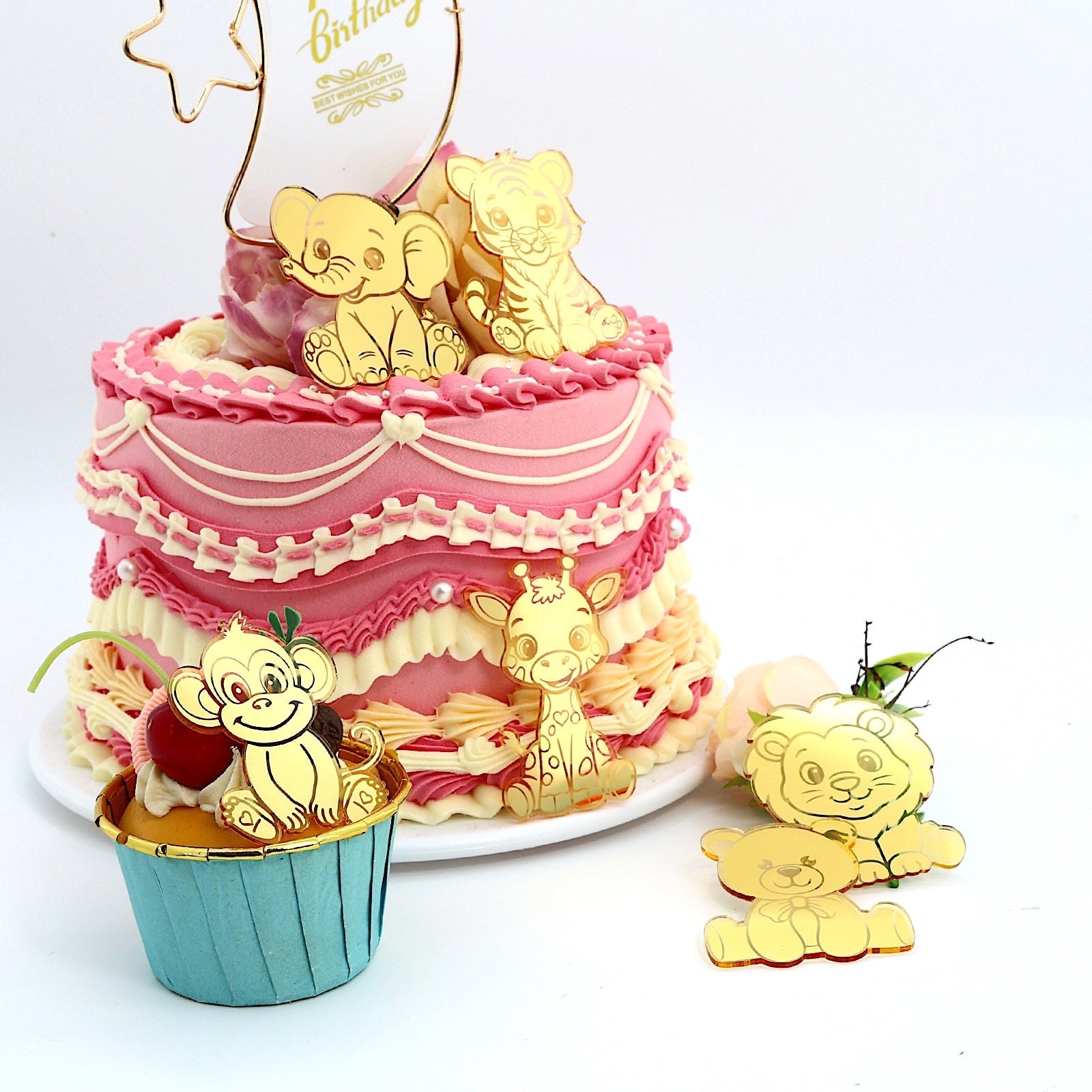 12pcs Gold Mirror Acrylic Animal Cupcake Toppers – Bear, Lion, Giraffe, Monkey, Elephant & Cheetah