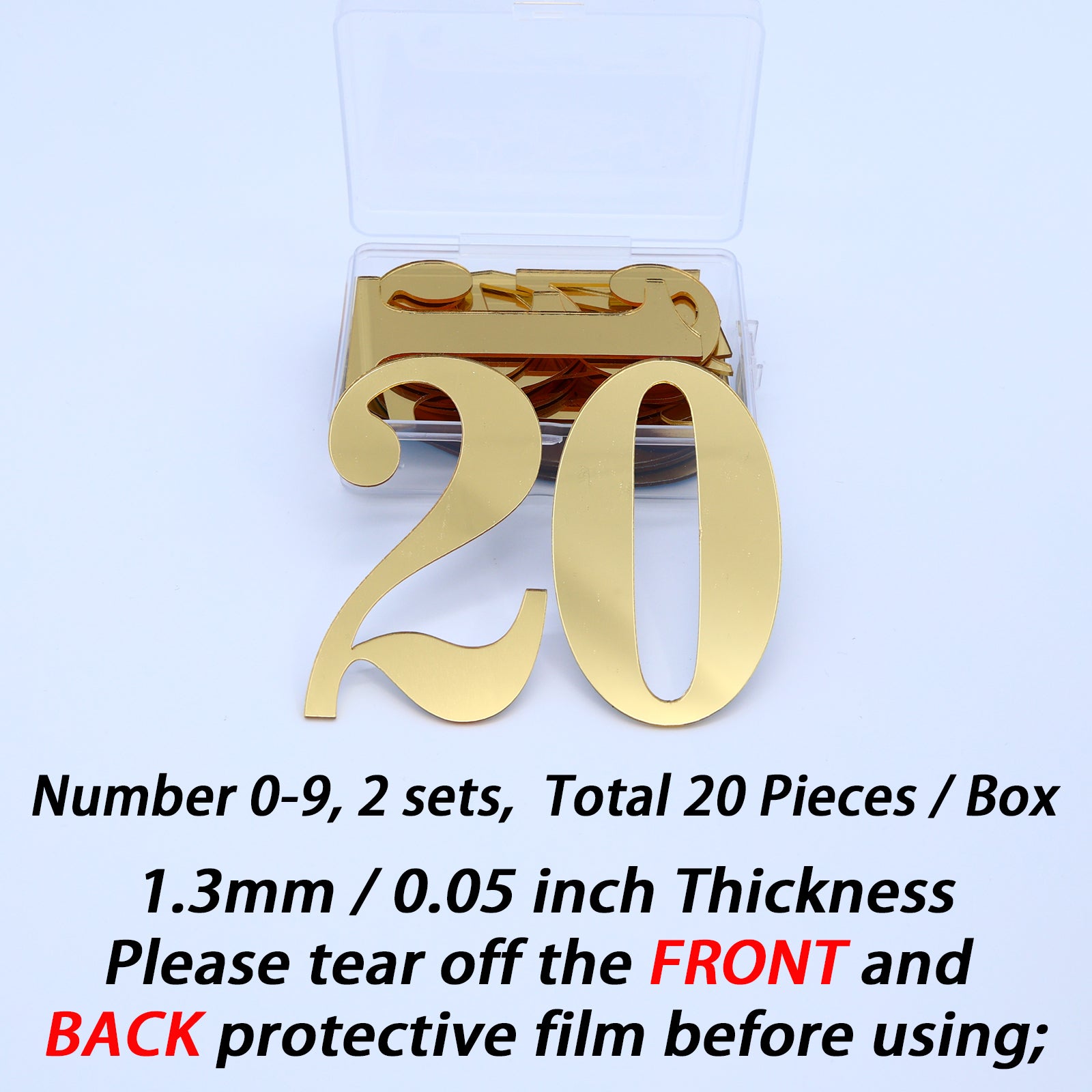 Crafted from premium 1.33mm thick acrylic, each number features a mirror gold front and a silver backing for a high-quality look. A protective film on both sides keeps them scratch-free until you’re ready to use them.
