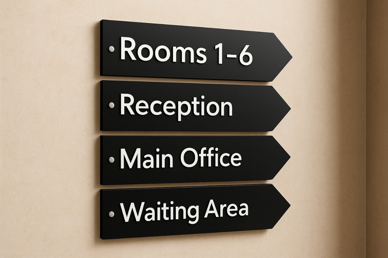 Our DISPLAY & WONDER Pointer Signs are crafted from glossy black acrylic with raised 3D lettering for a premium finish. Designed for offices, retail, hospitality, and public buildings, these signs are easy to install and ideal for guiding visitors with style.