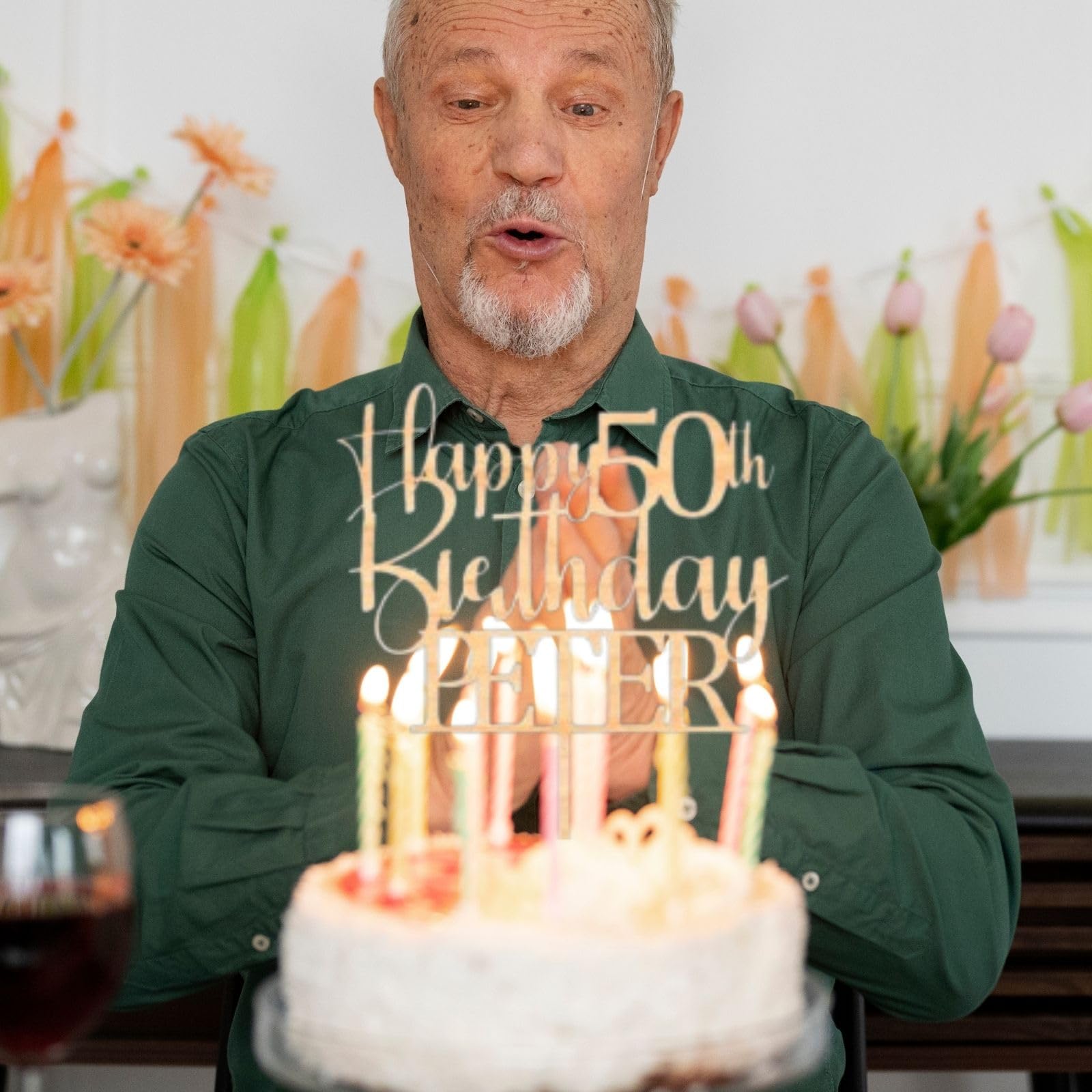 Happy 50th Birthday Wooden Cake Topper with Custom with any Name and Age, Personalised Wood Toppers by DISPLAY AND WONDER