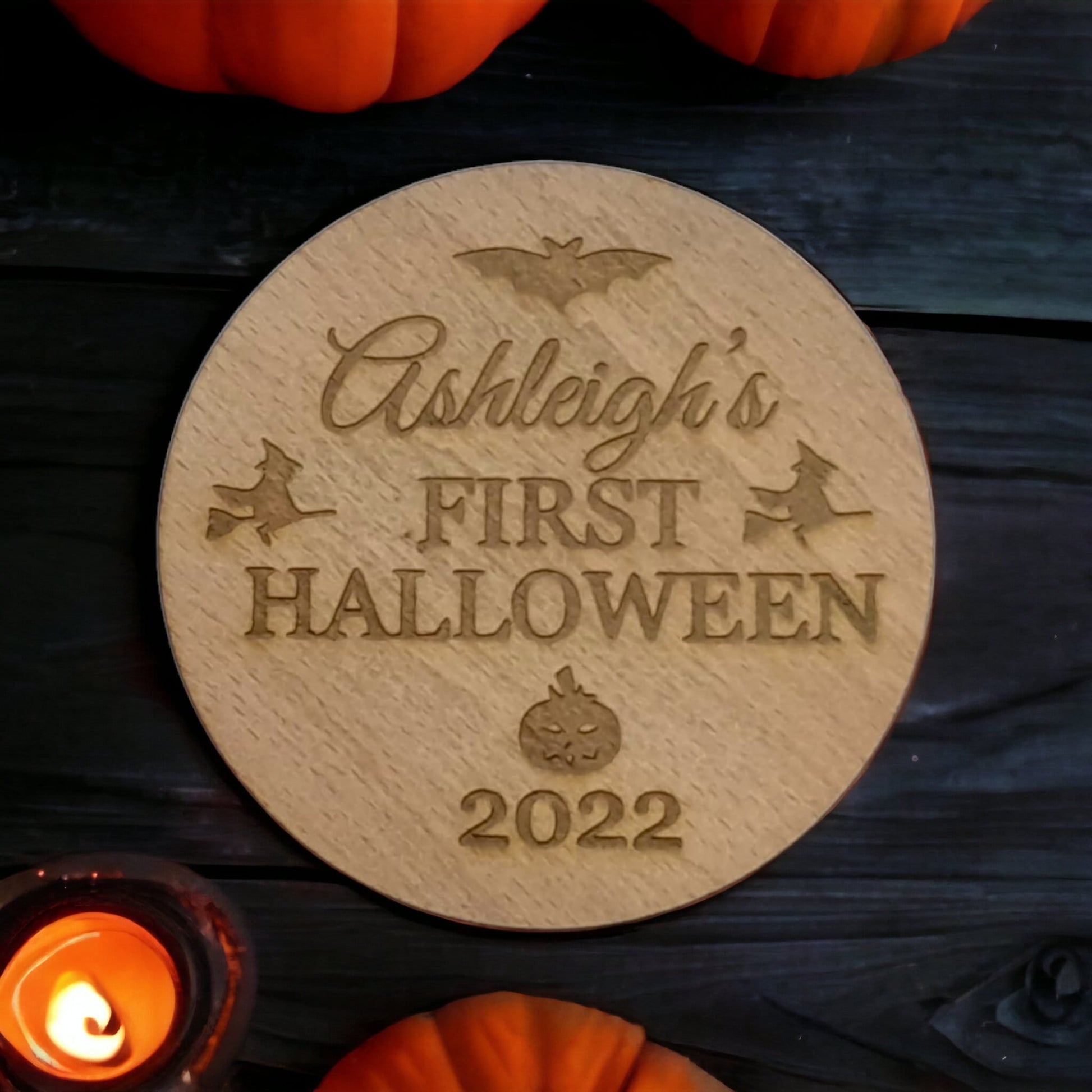 Celebrate their first Halloween with this wooden disc, personalised with the baby's name.