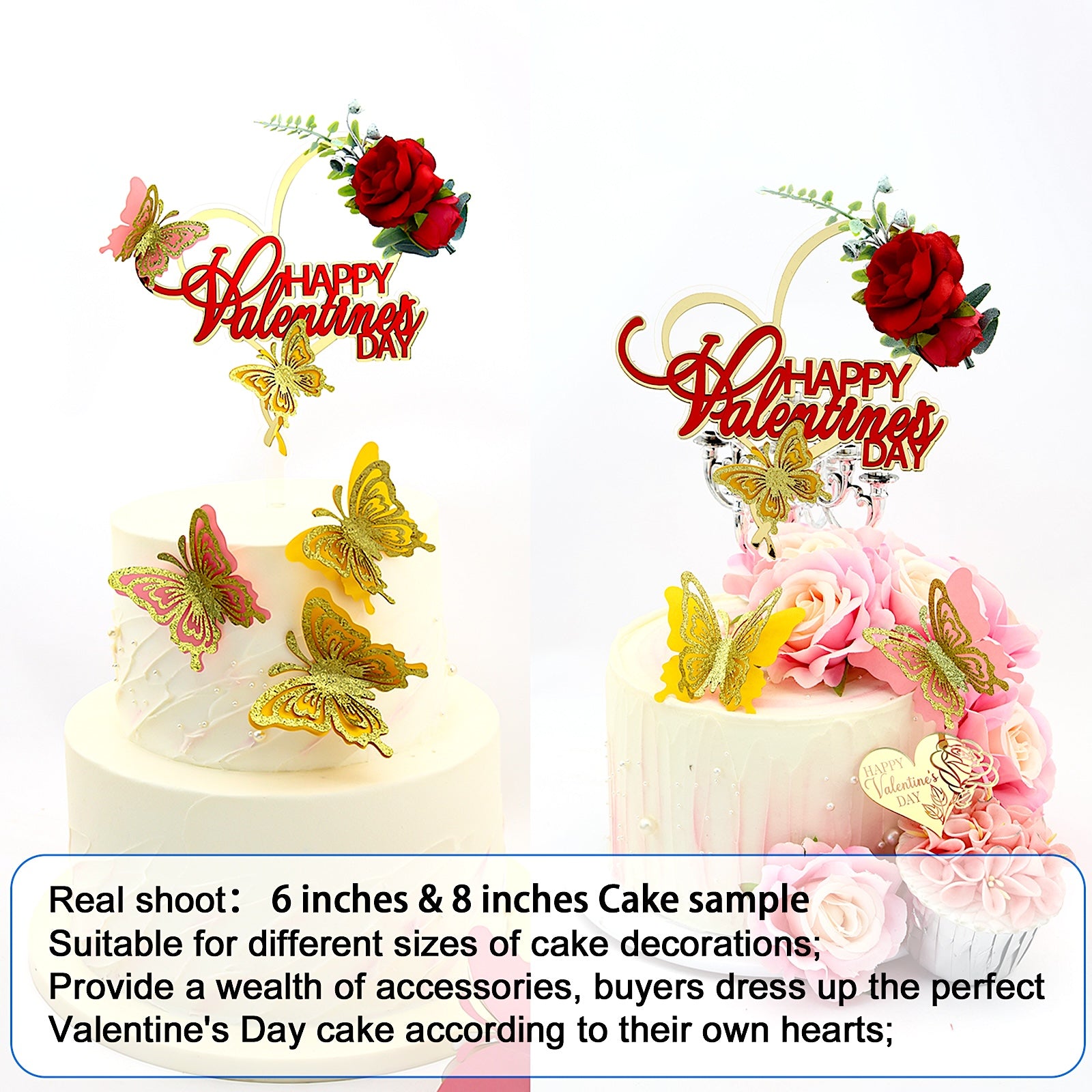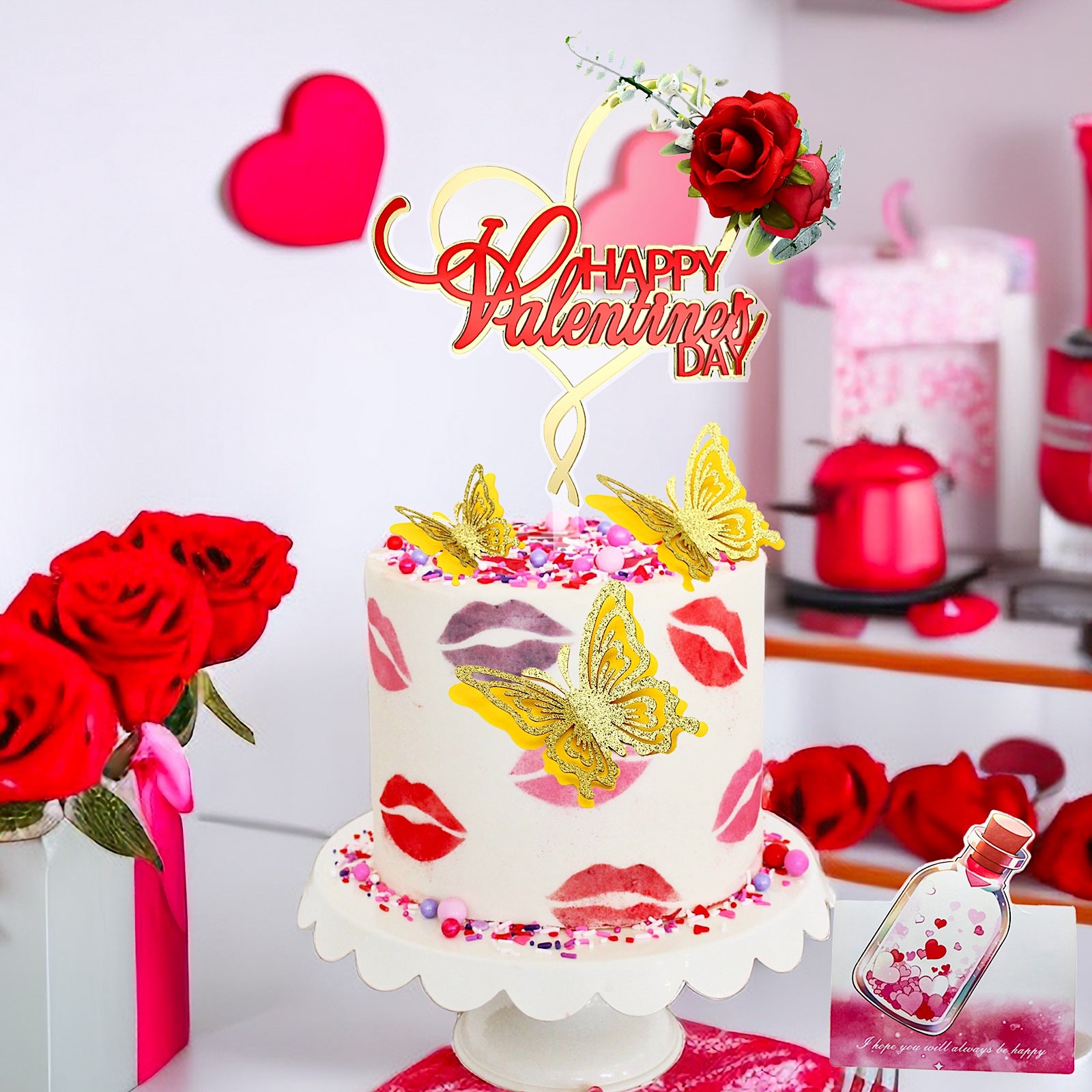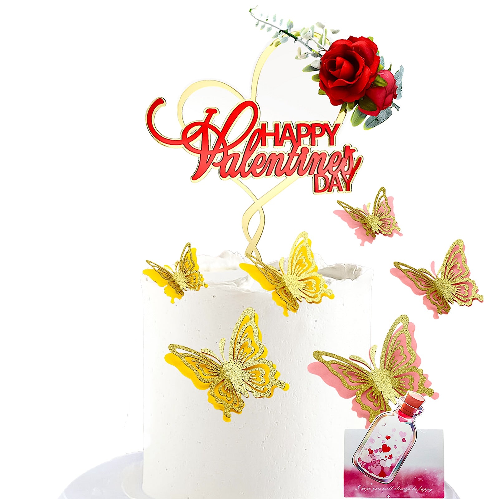 Valentine's Day Cake Topper Set – Elegant Acrylic Design with Butterflies, Rose Decoration & Gift Card – Perfect for Romantic Cakes & Parties